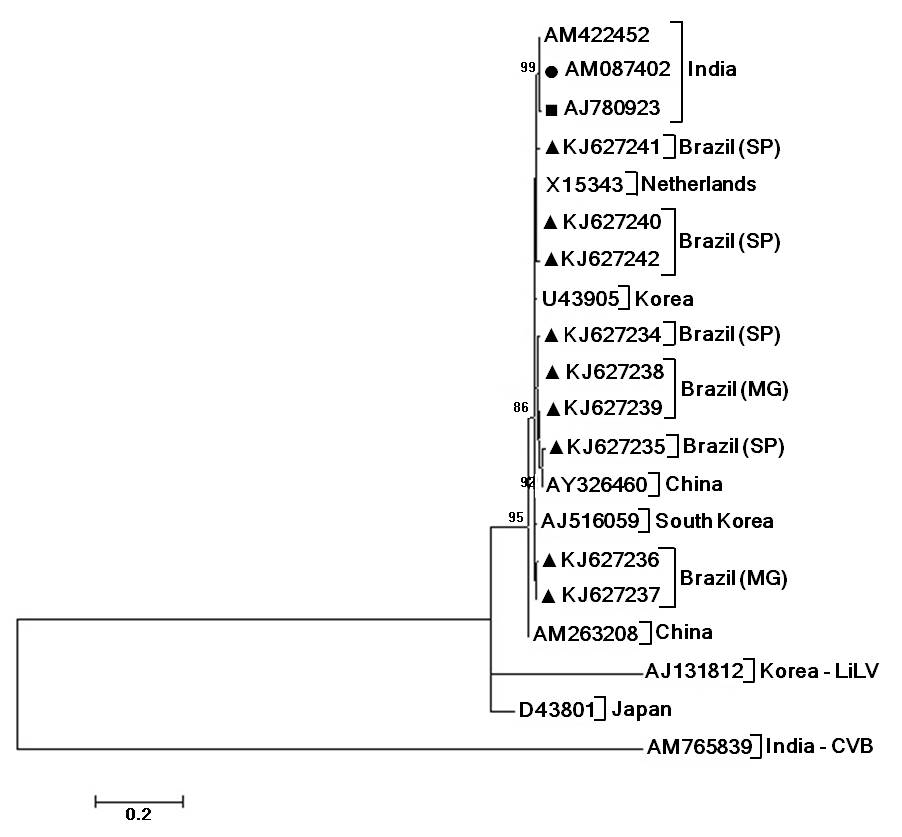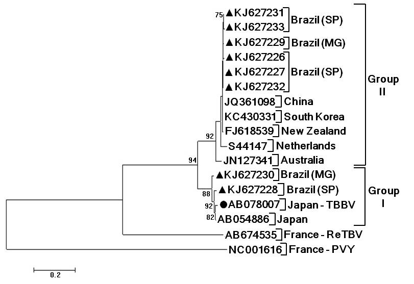 O objetivo deste trabalho foi descrever a ocorrência do Tulip breaking virus (TBV, sinonímia Lily mottle virus – LMoV) quarentenário e do Lily symptomless virus (LSV) e suas análises moleculares, para fornecer dados para a remoção do TBV da lista brasileira de pragas quarentenárias A1, pois este vírus está disseminado pelos principais cultivos comerciais de lírio no Brasil. A ocorrência desses vírus foi detectada em 12 regiões produtoras, por meio da reação de transcrição reversa multiplex (RT‑PCR), com uso de iniciadores específicos para os genes das respectivas capas proteicas (CP). Foram sequenciados oito fragmentos de 800 nucleotídeos (nt), obtidos de lírios infectados com LMoV, e nove fragmentos de 600 nt, obtidos de lírios infectados com LSV. A reconstrução da árvore filogenética mostrou um ramo robusto que continha as sequências brasileiras de LMoV, outros isolados de LMoV, TBV e Tulip band breaking virus, o que indica que todos são isolados de LMoV, embora agrupados em dois subgrupos. A análise filogenética também mostrou um ramo robusto que suporta todas as sequências brasileiras e outras de LSV, com exceção de um isolado japonês de LSV. Análises de recombinação também mostraram um isolado recombinante de LMoV, enquanto nenhum evento de recombinação foi detectado em LSV. Lily mottle virus é prevalente em cultivos de lírios no Brasil, em infecções simples e mistas com LSV ou Cucumber mosaic virus (CMV).Downloads